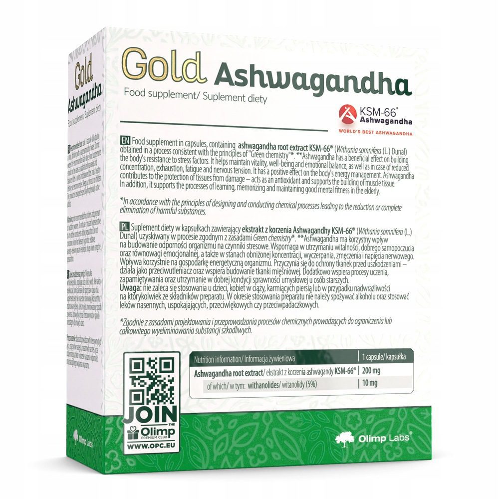 Olimp Gold Ashwagandha — это инновационная пищевая добавка от фармацевтической компании Olimp Laboratories, созданная на основе экстракта корня ашваганды KSM-66®. Этот стандартизированный экстракт гарантирует высочайшее содержание активных витанолидов — 5%, что обеспечивает максимальную эффективность для борьбы со стрессом, повышения энергии и улучшения когнитивных функций. Уникальная технология экстракции Green chemistry без спирта и химических растворителей сохраняет всю природную силу растения.
