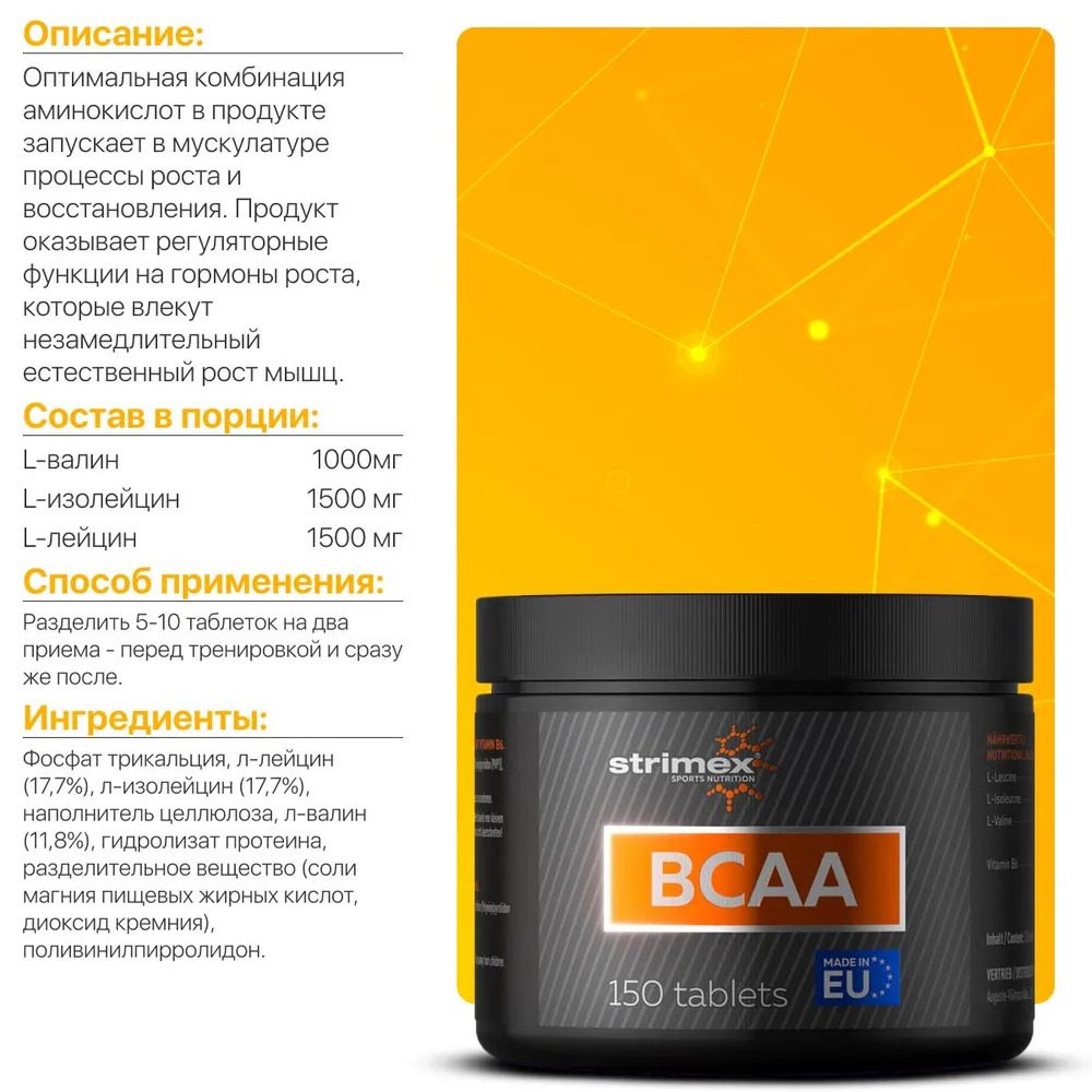 Топливо для твоих мышц в каждой таблетке! Не дай катаболизму разрушить результаты твоих тяжелых тренировок. BCAA от Strimex — это твоя страховка от мышечного распада и гарантия мощного анаболического отклика для роста сухой мышечной массы.